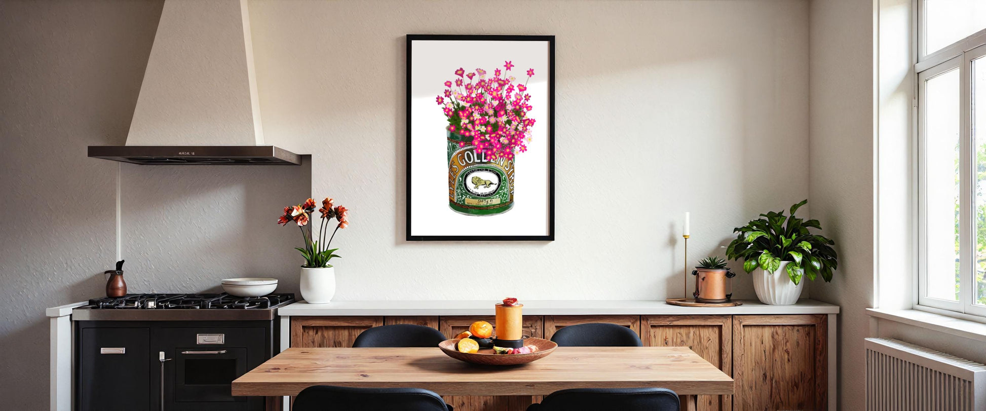This print is one for people who love bright colours and dainty flowers. Hand drawn illustration of Saxifraga bursting from a golden syrup tin, adding colour to any wall in your home.