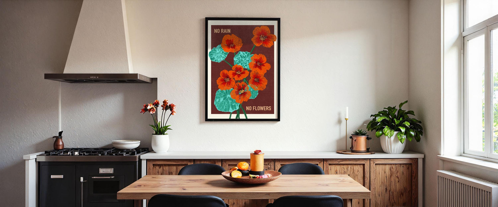 Retro Floral Art Print: 'No Rain No Flowers' Kitchen Wall Decor