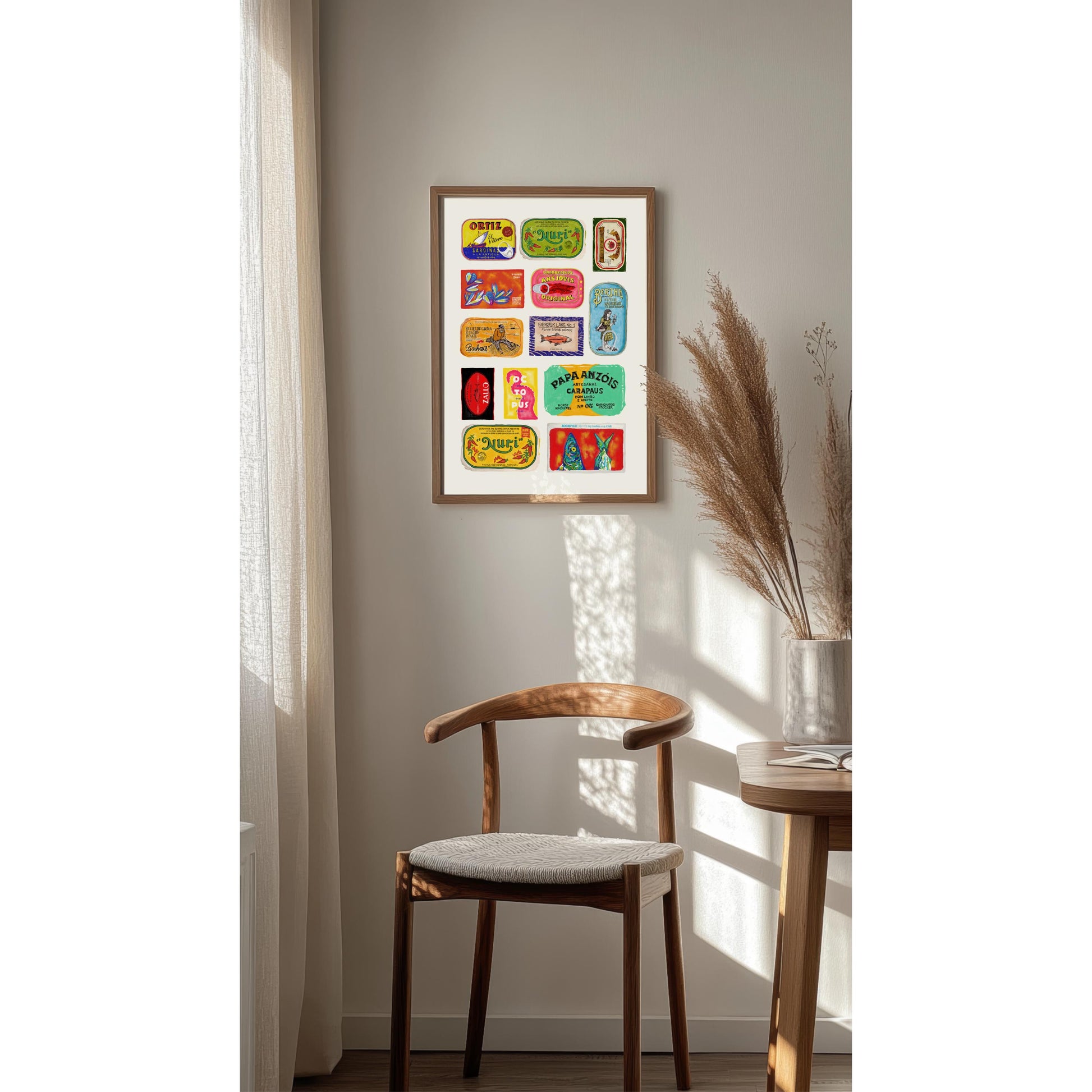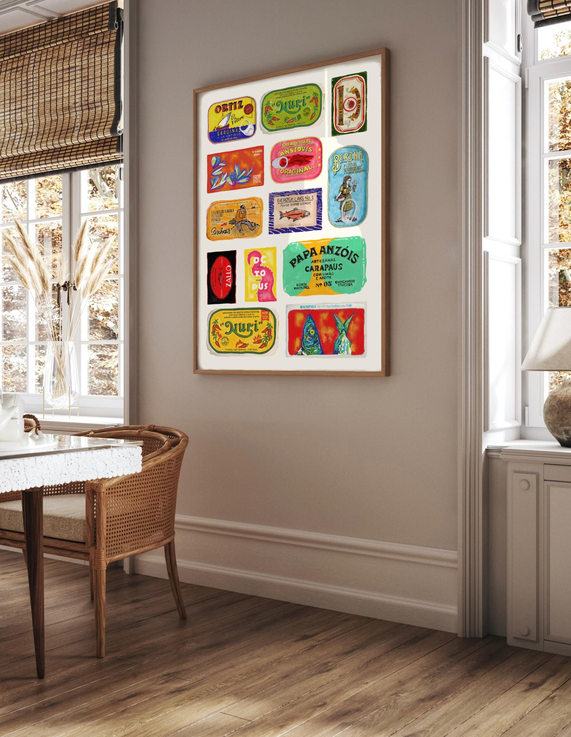 This print is one for the foodies who love retro packaging. Hand drawn illustration of bright and beautiful seafood tins, adding colour to any wall in your home.